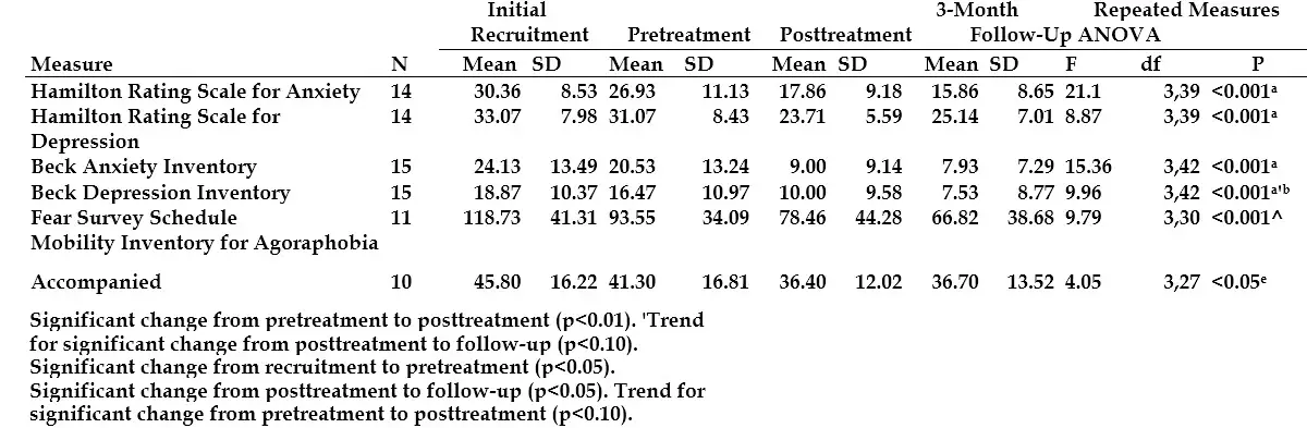 Repeated measures ANOVA indicated that among subjects for whom scores at all four primary assessment points were available, the Hamilton and Beck anxiety and depression scale scores showed small, statistically nonsignificant reductions from baseline to pretreatment, highly significant decreases over the course of the intervention (pretreatment to posttreatment), and maintenance of these changes from posttreatment to follow-up (table 1).