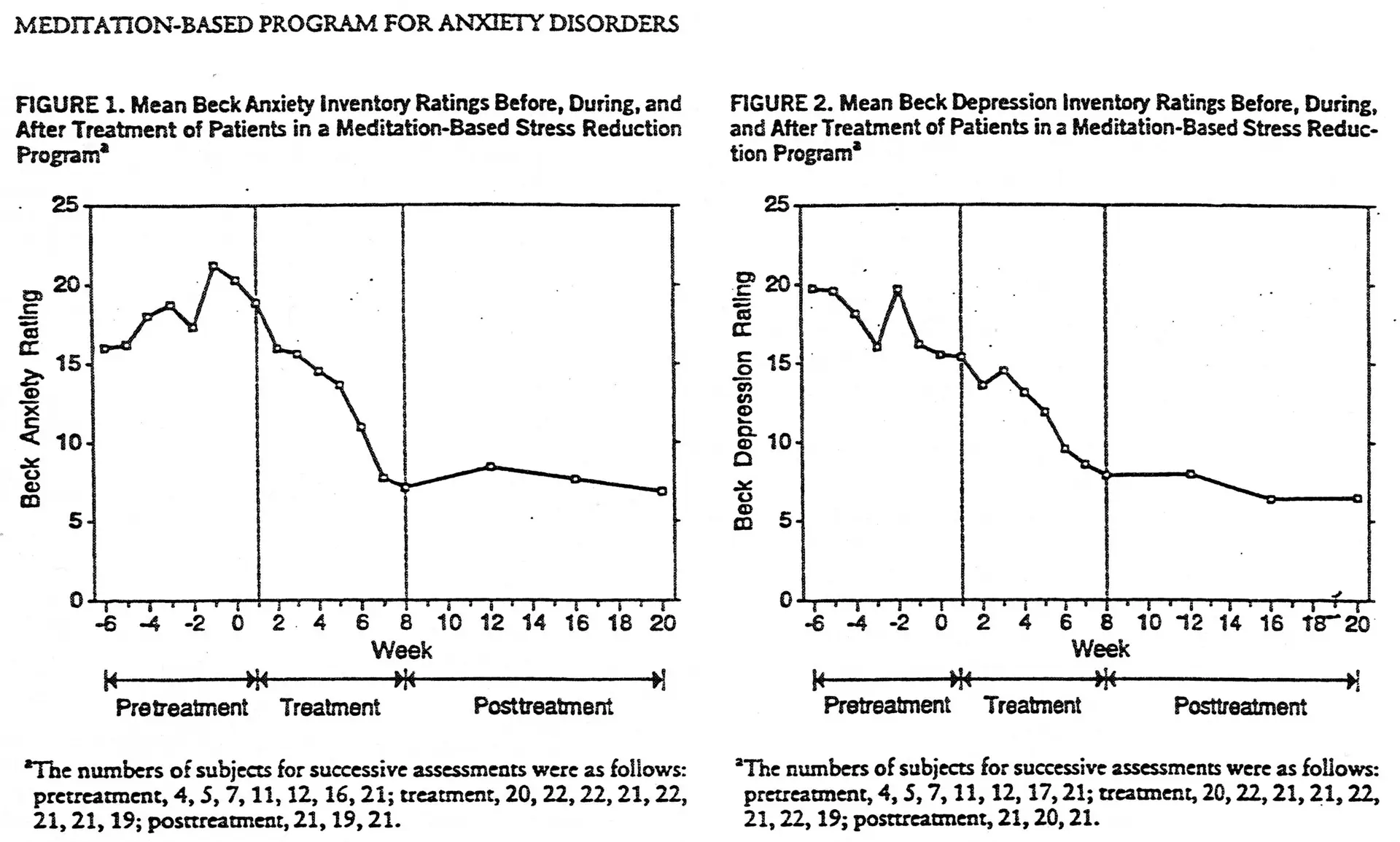 Method: The 22 study participants were screened with a structured clinical interview and found to meet the DSM-III-R criteria for a generalized anxiety disorder or panic disorder with or without agoraphobia. Assessments, including self-ratings and therapists’ ratings, were obtained weekly before and during the meditation-based stress reduction and relaxation program and monthly during the 3-month follow-up period.