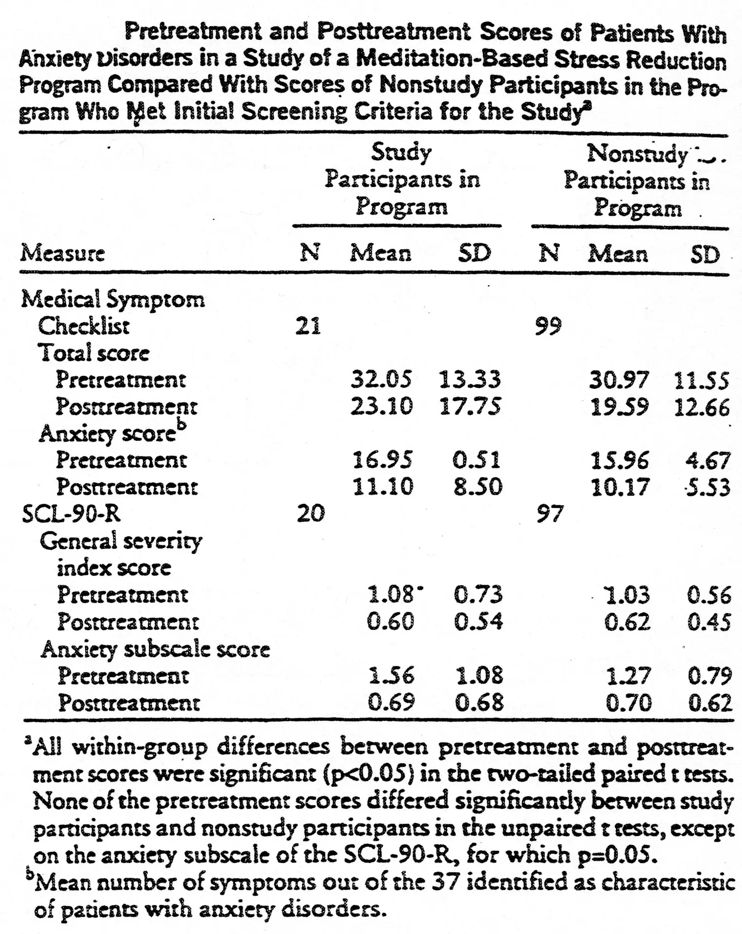 Because of the exploratory nature of the study, we used a repeated measures design with patients serving as their own controls on multiple pretreatment and post-treatment measures. In addition, study participants were compared on the SCL-90-R and Medical Symptom Checklist with other patients who met the initial screening criteria and were enrolled in the stress reduction and relaxation program at the same time period but who were not invited to take part in the study. This second group of patients (termed “nonstudy participants”) received the same meditation intervention but did not undergo screening or the weekly assessments that the study subjects underwent.